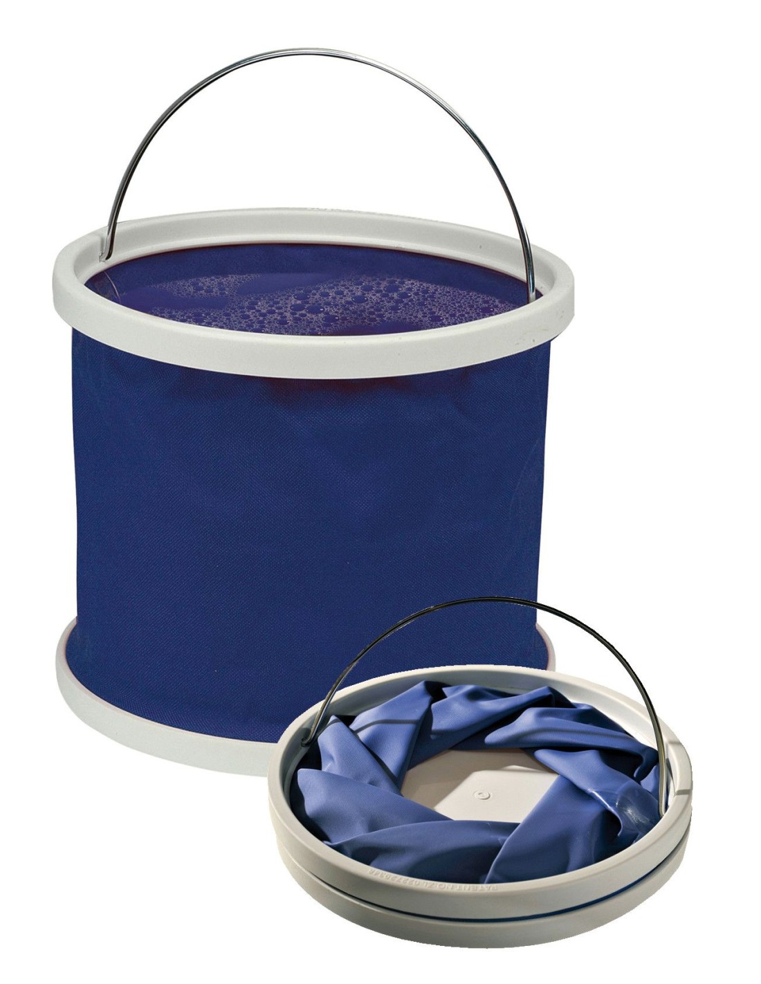 Seau pliant, se tient seul quand il est rempli d'eau. Facile à ranger. Matière PVC bleu de qualité extra résistant.